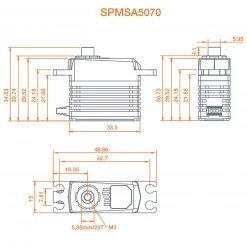 Spektrum high-voltage, brushless servos deliver dependable power and digital precision with amazing efficiency. Finely tuned electronics and software integrate with powerful brushless motor technology to offer ultra-smooth, high-speed performance more efficiently than servos with conventional motors. The all-aluminum case provides the ultimate solution in durability and heat dissipation, while precision metal gears complete a satisfaction package even the most critical pilot can appreciate.The Spektrum A5070 mini servo uses this solid foundation to achieve a whopping 190 oz/in of torque* and high transit speeds of .07 sec* in addition to its outstanding balance of durability, value, plus the peace-of-mind that sophisticated error correction and over-current/temperature protection offers. Itβs an impressive feature combination that makes this mighty servo an outstanding airplane or heli servo choice.